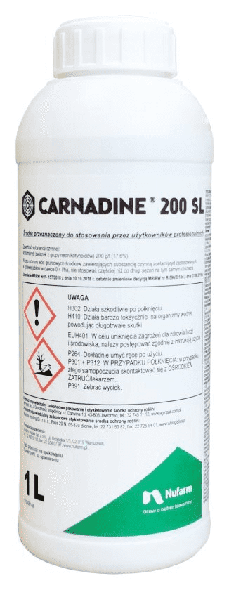 CARNADINE 200 SL Środek przeznaczony do stosowania przez użytkowników profesjonalnych Zawartość substancji czynnej: acetamipryd (związek z grupy neonikotynoidów) 200 g/l (17,6%) W celu ochrony wód gruntowych środków zawierających substancję czynną acetamipryd zastosowanych w uprawie jabłoni w dawce 0,4 l/ha, nie stosować częściej niż co drugi sezon na tym samym obszarze. Zezwolenie MRiRW Nr R- 157/2018 z dnia 10.10.2018 r. ostatnio zmienione decyzją MRiRW nr R-596/2019d z dnia 22.08.2019 r. Uwaga H302 H410 Działa szkodliwie po połknięciu. Działa bardzo toksycznie na organizmy wodne, powodując długotrwałe skutki. EUH 401 W celu uniknięcia zagrożeń dla zdrowia ludzi i środowiska, należy postępować zgodnie z instrukcją użycia. P264 P301 + P312 P391 Dokładnie umyć ręce po użyciu. W PRZYPADKU POŁKNIĘCIA: w przypadku złego samopoczucia skontaktować się z OŚRODKIEM ZATRUĆ/lekarzem. Zebrać wyciek. OPIS DZIAŁANIA INSEKTYCYD w formie koncentratu rozpuszczalnego w wodzie (SL), o działaniu kontaktowym i żołądkowym. Na roślinie działa powierzchniowo, wgłębnie i układowo. Zgodnie z klasyfikacją IRAC substancja czynna acetamipryd zaliczana jest do grupy neonikotynoidów (grupa 4A). 2 Załącznik do decyzji MRiRW nr R-596/2019d z dnia 22.08.2019 r. zmieniającej zezwolenie MRiRW nr R-157/2018 z dnia 10.10.2018 r. Etykieta środka ochrony roślin Carnadine 200 SL, załącznik do decyzji MRiRW STOSOWANIE ŚRODKA Środek przeznaczony do stosowania przy użyciu samobieżnych lub ciągnikowych opryskiwaczy polowych lub sadowniczych. Ziemniak stonka ziemniaczana (larwy i chrząszcze) Maksymalna dawka dla jednorazowego zastosowania: 0,18 l/ha Zalecana dawka dla jednorazowego zastosowania: 0,12-0,18 l/ha Wyższą z zalecanych dawek należy zastosować w przypadku bujnie rozwiniętej naci ziemniaczanej lub dużej liczebności stonki ziemniaczanej. Termin stosowania: zabieg wykonać w momencie składania jaj i masowego wylęgu larw, od fazy gdy drugi liść właściwy jest rozwinięty na pędzie głównym (min. 4 cm) do końca fazy rozwoju owoców (BBCH 12-79). Zalecana ilość wody: 200-400 l/ha Zalecane opryskiwanie: średniokropliste Maksymalna liczba zabiegów w sezonie wegetacyjnym:1 Rzepak ozimy chowacz brukwiaczek Maksymalna dawka dla jednorazowego zastosowania: 0,3 l/ha Zalecana dawka dla jednorazowego zastosowania: 0,15-0,3 l/ha Liczba zabiegów: 1 Termin stosowania: Stosować po wystąpieniu chrząszczy na plantacji, zgodnie z sygnalizacją. Zabieg wykonać w fazie wydłużania pędu, od momentu, gdy widoczne jest pierwsze międzywęźle do fazy 9 międzywęźli (BBCH 31-39). Zalecana ilość wody: 200-400 L/ha Zalecane opryskiwanie: średniokropliste chowacz czterozębny Maksymalna dawka dla jednorazowego zastosowania: 0,3 l/ha Zalecana dawka dla jednorazowego zastosowania: 0,15-0,3 l/ha Liczba zabiegów: 1 Termin stosowania: Zabieg wykonać od fazy, gdy widoczne jest pierwsze międzywęźle do fazy „żółtego pąka”, gdy widoczne są pierwsze płatki, a pąki kwiatowe są nadal zamknięte (BBCH 31-59). Zalecana ilość wody: 200-400 l/ha Zalecane opryskiwanie: średniokropliste słodyszek rzepakowy Maksymalna dawka dla jednorazowego zastosowania: 0,3 l/ha Zalecana dawka dla jednorazowego zastosowania: 0,18-0,3 l/ha Liczba zabiegów: 1 Termin stosowania: Stosować po wystąpieniu chrząszczy na plantacji, zgodnie z sygnalizacją. Zabieg wykonać od fazy, gdy pąki kwiatowe zamknięte są w liściach do otwarcia pierwszych kwiatów (BBCH 50-60). Zalecana ilość wody: 200-400 l/ha Zalecane opryskiwanie: średniokropliste chowacz podobnik, pryszczarek kapustnik Maksymalna dawka dla jednorazowego zastosowania: 0,3 l/ha Zalecana dawka dla jednorazowego zastosowania: 0,15-0,3 l/ha Liczba zabiegów: 1 3 Załącznik do decyzji MRiRW nr R-596/2019d z dnia 22.08.2019 r. zmieniającej zezwolenie MRiRW nr R-157/2018 z dnia 10.10.2018 r. Etykieta środka ochrony roślin Carnadine 200 SL, załącznik do decyzji MRiRW Termin stosowania: Zabieg wykonać od początku fazy kwitnienia, gdy jest co najmniej 10% otwartych kwiatów na głównym kwiatostanie (faza początku kwitnienia) do początku fazy rozwoju owoców, gdy 10% łuszczyn osiągnęło typową wielkość (BBCH 61-71). Zalecana ilość wody: 200-400 l/ha Zalecane opryskiwanie: średniokropliste Maksymalna liczba zabiegów w rzepaku ozimym w sezonie wegetacyjnym: 2 Odstęp między zabiegami: co najmniej 7 dni Jabłoń owocówka jabłkóweczka Maksymalna dawka dla jednorazowego zastosowania: 0,4 l/ha Zalecana dawka dla jednorazowego zastosowania: 0,2- 0,4 l/ha. Liczba zabiegów: 1 Termin stosowania: Opryskiwać na początku lotu motyli i masowego składania jaj, zgodnie z sygnalizacją, to jest w fazie rozwojowej jaja szkodnika zwanej "czarną główką". Środek stosować od początku okresu kwitnienia, gdy jest otwartych jest około 20% kwiatów (BBCH 62) do początku okresu karencji, najpóźniej 14 dni przed zbiorem owoców. Zalecana ilość wody: 500-900 l/ha W przypadku tego zastosowania środków zawierających acetamipryd nie wolno stosować w kolejnym roku, niezależnie od dawki. mszyca jabłoniowa Zalecana/maksymalna dawka środka dla jednorazowego zastosowania: 0,125 l/ha Liczba zabiegów: 1 Termin stosowania: Środek stosować od początku okresu kwitnienia, gdy jest otwartych jest około 20% kwiatów (BBCH 62) do początku okresu karencji, tj. najpóźniej 14 dni przed zbiorem owoców. Zalecana ilość wody: 500-900 l/ha Zalecane opryskiwanie: średniokropliste Maksymalna liczba zabiegów w uprawie jabłoni w sezonie wegetacyjnym: 2 Odstęp między zabiegami: co najmniej 8 dni Uwaga: Środków zawierających substancję czynną acetamipryd zastosowanych w uprawie jabłoni w dawce 0,4 l/ha, nie stosować częściej niż co drugi sezon na tym samym obszarze. STOSOWANIE ŚRODKA OCHRONY ROŚLIN W UPRAWACH I ZASTOSOWANIACH MAŁOOBSZAROWYCH Odpowiedzialność za skuteczność działania i fito