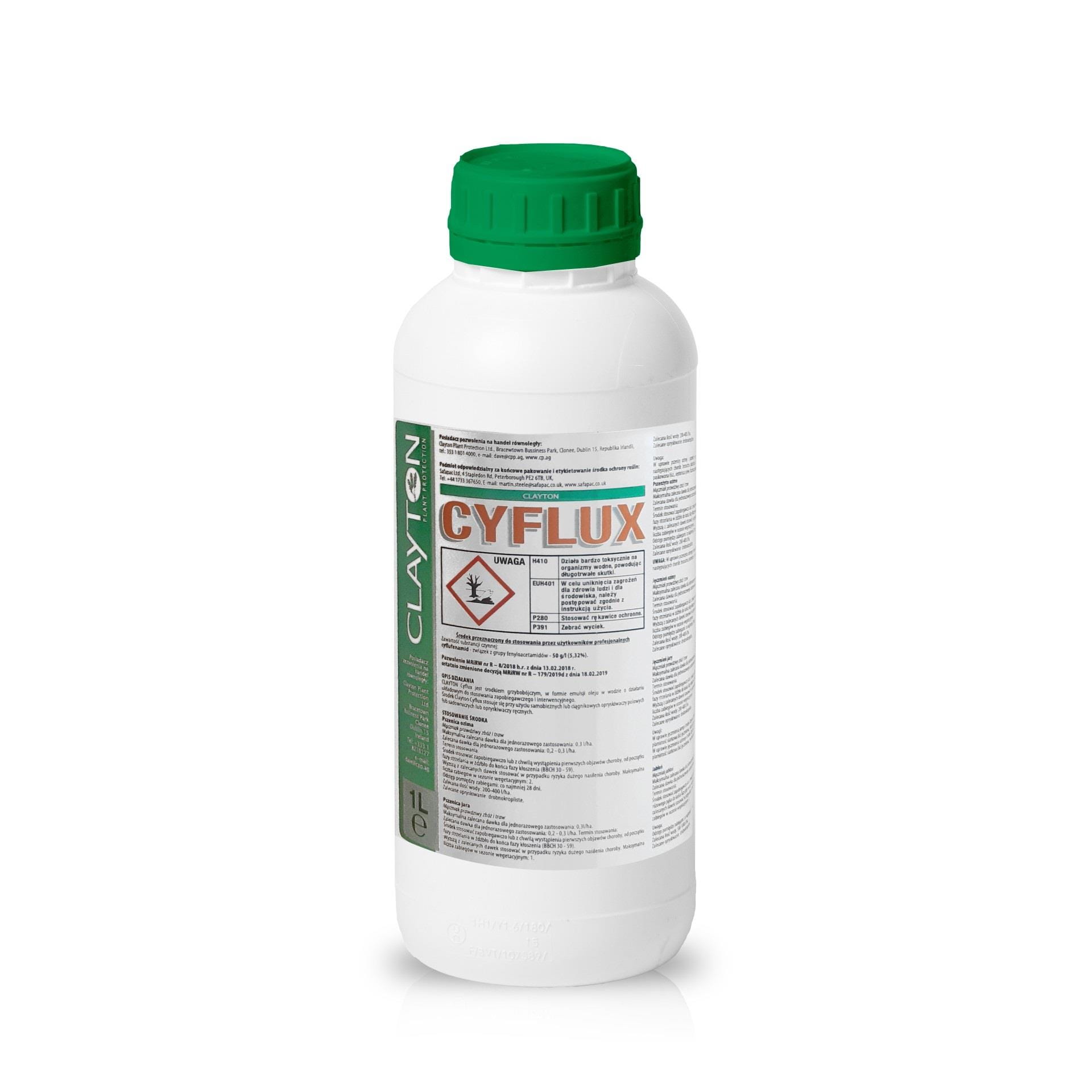 Clayton Cyflux jest środkiem grzybobójczym (fungicyd), w formie emulsji oleju w wodzie. Na roślinie działa układowo do stosowania zapobiegawczego i interwencyjnego.