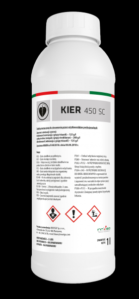 Załącznik do zezwolenia MRiRW nr R- 93/2018 z dnia 27.04.2018 r. Posiadacz zezwolenia: Innvigo Sp z o.o., Al. Jerozolimskie 178, 02-486 Warszawa, tel.: +48 22 468 26 70 e-mail: biuro@innvigo.com KIER 450 SC Środek przeznaczony do stosowania przez użytkowników profesjonalnych Zawartość substancji czynnej: azoksystrobina (związek z grupy strobiluryn) – 200 g/l (17,84 %) difenokonazol (substancja z grupy triazoli) – 125 g/l (11,15 %) tebukonazol (substancja z grupy triazoli) – 125 g/l (11,15 %) Zezwolenie MRiRW nr R- 93/2018 z dnia 27.04.2018 r. Uwaga H302 Działa szkodliwie po połknięciu. H315 Działa drażniąco na skórę. H332 Działa szkodliwie w następstwie wdychania. H361d Podejrzewa się, że działa szkodliwie na dziecko w łonie matki. H410 Działa bardzo toksycznie na organizmy wodne, powodując długotrwałe skutki. EUH 401 W celu uniknięcia zagrożeń dla zdrowia ludzi i środowiska, należy postępować zgodnie z instrukcją użycia. EUH 208 Zawiera 1,2-Benzizotiazolin-3-on. Może powodować wystąpienie reakcji alergicznej. P261 Unikać wdychania rozpylonej cieczy. P280 Stosować rękawice ochronne/odzież ochronną. P302 + P352 W PRZYPADKU KONTAKTU ZE SKÓRĄ: Umyć dużą ilością wody/mydłem. P304 + P340 W PRZYPADKU DOSTANIA SIĘ DO DRÓG ODDECHOWYCH: wyprowadzić lub wynieść poszkodowanego na świeże powietrze i zapewnić mu warunki do odpoczynku w pozycji umożliwiającej swobodne oddychanie. P308 + P313 W przypadku narażenia lub styczności: Zasięgnąć porady/zgłosić się pod opiekę lekarza. P391 Zebrać wyciek. OPIS DZIAŁANIA FUNGICYD, koncentrat w formie stężonej zawiesiny (SC), o działaniu układowym, do stosowania zapobiegawczego i interwencyjnego przed chorobami grzybowymi. 2 Etykieta środka ochrony roślin Kier 450 SC STOSOWANIE ŚRODKA Środek przeznaczony do stosowania przy użyciu samobieżnych lub ciągnikowych opryskiwaczy polowych. Pszenica ozima Septorioza paskowana liści pszenicy, septorioza plew, rdza brunatna pszenicy, mączniak prawdziwy zbóż i traw (średni poziom zwalczania) Maksymalna dawka dla jednorazowego zastosowania: 1,0 l/ha Zalecana dawka dla jednorazowego zastosowania: 0,9 - 1,0 l/ha Termin stosowania: środek stosować zapobiegawczo lub z chwilą wystąpienia pierwszych objawów chorób, od fazy 1. kolanka do końca fazy kłoszenia (BBCH 31-59). Środek stosować 1-2 razy w sezonie, w odstępie co 21-32 dni. W przypadku konieczności wykonania dwóch zabiegów, pierwszy zabieg zaleca się wykonać od fazy 1. kolanka do początku grubienia pochwy liściowej liścia flagowego (wczesna faza rozwoju kłosa) (BBCH 31-41), a drugi zabieg od fazy otwarcia pochwy liściowej liścia flagowego do końca fazy kłoszenia (BBCH 47-59). Maksymalna liczba zabiegów w sezonie wegetacyjnym: 2 Odstęp między zabiegami: co najmniej 21dni. Zalecana ilość wody: 200-300 l/ha Zalecane opryskiwanie: drobnokropliste Pszenżyto ozime septorioza liści, rdza brunatna pszenicy, mączniak prawdziwy zbóż i traw (średni poziom zwalczania) Maksymalna dawka dla jednorazowego zastosowania: 1,0 l/ha Zalecana dawka dla jednorazowego zastosowania: 0,9 - 1,0 l/ha Termin stosowania: środek stosować zapobiegawczo lub z chwilą wystąpienia pierwszych objawów chorób, od fazy 1. kolanka do końca fazy kłoszenia (BBCH 31-59). Środek stosować 1-2 razy w sezonie, w odstępie co 21-32 dni. W przypadku konieczności wykonania dwóch zabiegów, pierwszy zabieg zaleca się wykonać od fazy 1. kolanka do początku grubienia pochwy liściowej liścia flagowego (wczesna faza rozwoju kłosa) (BBCH 31-41), a drugi zabieg od fazy otwarcia pochwy liściowej liścia flagowego do końca fazy kłoszenia (BBCH 47-59). Maksymalna liczba zabiegów w sezonie wegetacyjnym: 2 Odstęp między zabiegami: co najmniej 21dni. Zalecana ilość wody: 200-300 l/ha Zalecane opryskiwanie: drobnokropliste Żyto ozime mączniak prawdziwy zbóż i traw, rdza brunatna żyta Maksymalna dawka dla jednorazowego zastosowania: 1,0 l/ha Zalecana dawka dla jednorazowego zastosowania: 0,9 - 1,0 l/ha Termin stosowania: środek stosować zapobiegawczo lub z chwilą wystąpienia pierwszych objawów chorób, od fazy 1. kolanka do końca fazy kłoszenia (BBCH 31-59). Środek stosować 1-2 razy w sezonie, w odstępie co 21-32 dni. W przypadku konieczności wykonania dwóch zabiegów, pierwszy zabieg zaleca się wykonać od fazy 1. kolanka do początku grubienia pochwy liściowej liścia flagowego (wczesna faza rozwoju kłosa) (BBCH 31-41), a drugi zabieg od fazy otwarcia pochwy liściowej liścia flagowego do końca fazy kłoszenia (BBCH 47-59). Maksymalna liczba zabiegów w sezonie wegetacyjnym: 2 Odstęp między zabiegami: co najmniej 21dni. Zalecana ilość wody: 200-300 l/ha 3 Etykieta środka ochrony roślin Kier 450 SC Zalecane opryskiwanie: drobnokropliste Jęczmień jary plamistość siatkowa jęczmienia, rdza jęczmienia, mączniak prawdziwy zbóż i traw (średni poziom zwalczania) Maksymalna dawka dla jednorazowego zastosowania: 1,0 l/ha Zalecana dawka dla jednorazowego zastosowania: 0,9 - 1,0 l/ha Termin stosowania: środek stosować zapobiegawczo lub z chwilą wystąpienia pierwszych objawów chorób, od fazy 1. kolanka do końca fazy kłoszenia (BBCH 31-59). Środek stosować 1-2 razy w sezonie, w odstępie co 21-32 dni. W przypadku konieczności wykonania dwóch zabiegów, pierwszy zabieg zaleca się wykonać od fazy 1. kolanka do początku grubienia pochwy liściowej liścia flagowego (wczesna faza rozwoju kłosa) (BBCH 31-41), a drugi zabieg od fazy otwarcia pochwy liściowej liścia flagowego do końca fazy kłoszenia (BBCH 47-59). Maksymalna liczba zabiegów w sezonie wegetacyjnym: 2 Odstęp między zabiegami: co najmniej 21dni. Zalecana ilość wody: 200-300 l/ha Zalecane opryskiwanie: drobnokropliste Rzepak ozimy szara pleśń, zgnilizna twardzikowa Maksymalna dawka dla jednorazowego zastosowania: 1,0 l/ha Zalecana dawka dla jednorazowego zastosowania: 0,9 - 1,0 