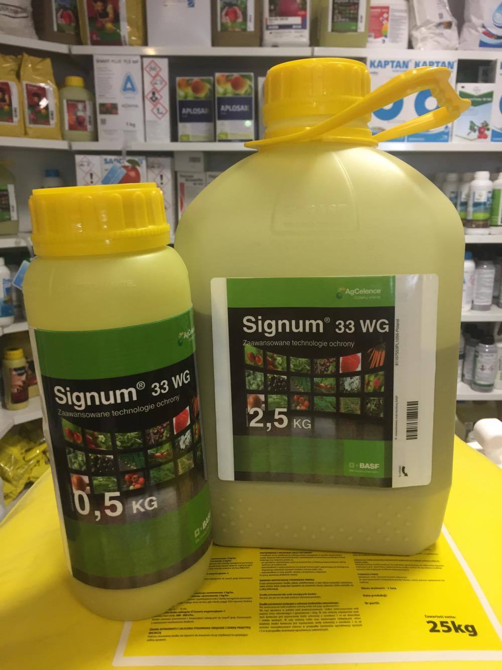 Termin stosowania: Pierwszy zabieg wykonać zapobiegawczo lub z chwilą pojawienia się pierwszych objawów choroby. Środek stosować w odstępie co 7-10 dni, przemiennie z fungicydami o odmiennym mechanizmie działania. Maksymalnie wykonać 1-2 zabiegi środkiem Signum 33 WG w sezonie.